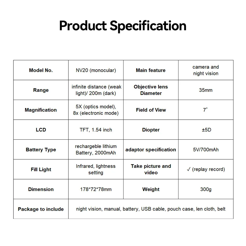 Profitez d'une image nette et claire grâce à l'écran LCD couleur TFT. Capturez vos moments les plus précieux avec la possibilité de prendre des photos ou d'enregistrer des vidéos. Avec une batterie lithium rechargeable offrant jusqu'à 7 heures d'utilisation, cet appareil est parfait pour une variété d'activités extérieures telles que l'observation, la chasse, la randonnée et bien plus encore.