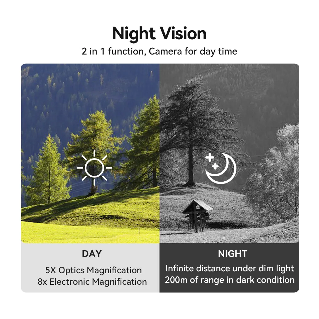 Avec une capacité de grossissement de 5x (optique) et 8x (électronique), cet appareil offre une clarté remarquable grâce à son objectif de 35mm. Son champ de vision de 7° x 3.9° garantit une vue étendue pour capturer tous les détails, qu'il s'agisse de la nuit ou du jour. Sa résistance à l'eau IPX5 le rend parfait pour les aventures en extérieur.